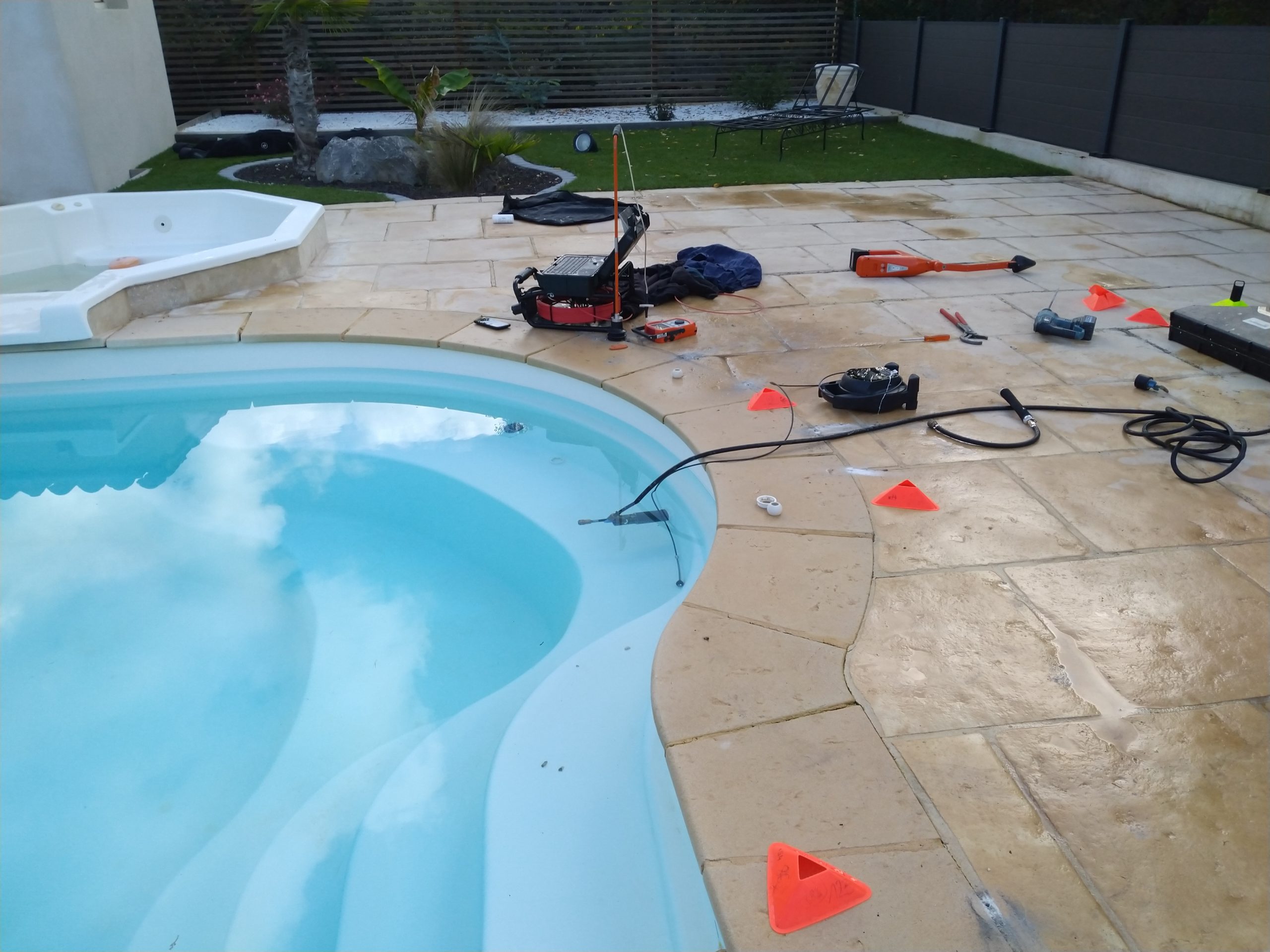 Une étape essentielle dans la réparation des fuites de piscine est la localisation des canalisations fuyardes enterrées. Après avoir déterminé quelle canalisation présente une fuite par le test de pression, nous procédons à sa détection et à son traçage au sol, afin de savoir où installer les appareils nécessaires à l’identification exacte de la fuite. Cette étape permet de cibler précisément l’emplacement du réseau fuyard, facilitant ainsi la réparation sans excavation inutile.
